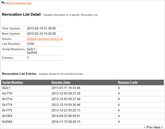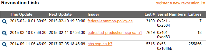 To view the details for the certificate issuer of a particular revocation list, click on the magnifying glass to the left of the CRL.