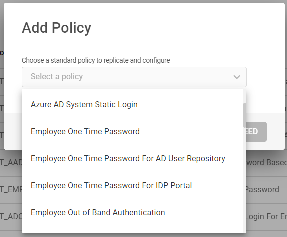 From the drop-down menu, choose a standard OTP authentication policy to replicate for the newly created authentication policy, and then click PROCEED.
