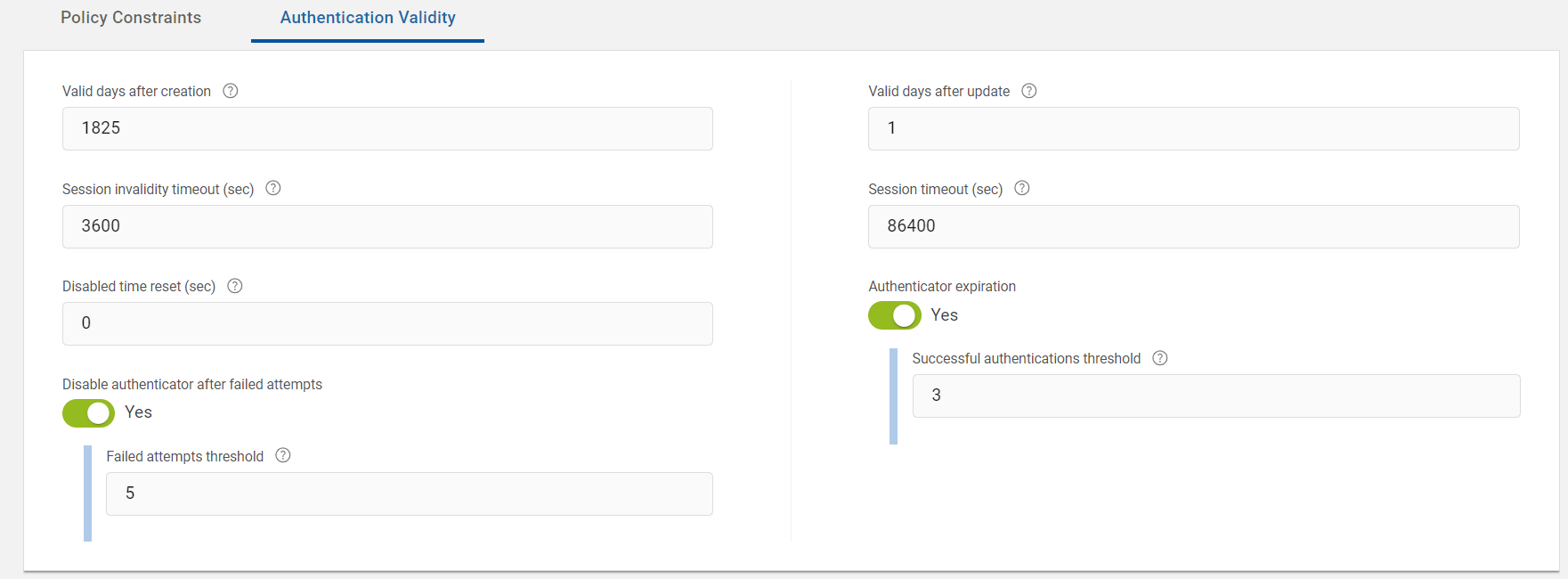 You can also view the parameters of Policy Constraints and Authentication Validity settings.