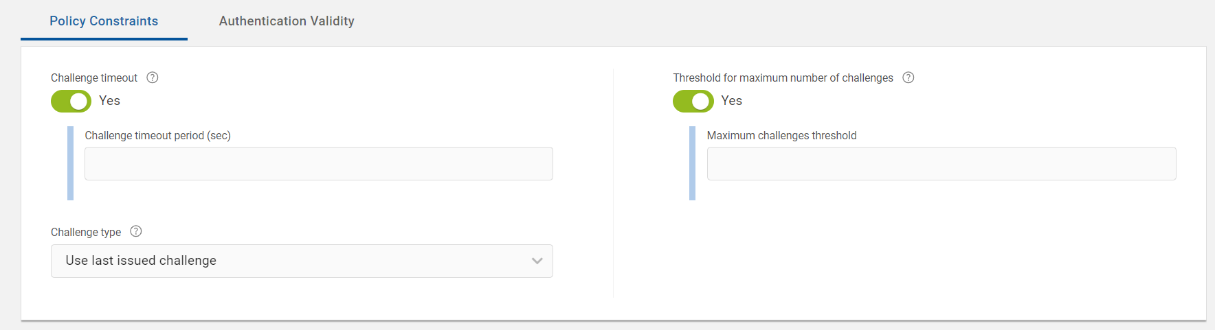 This section describes the Policy Constraints tab parameters, which are related to number of challenges, types of challenges and its validity for this OTP authentication policy.