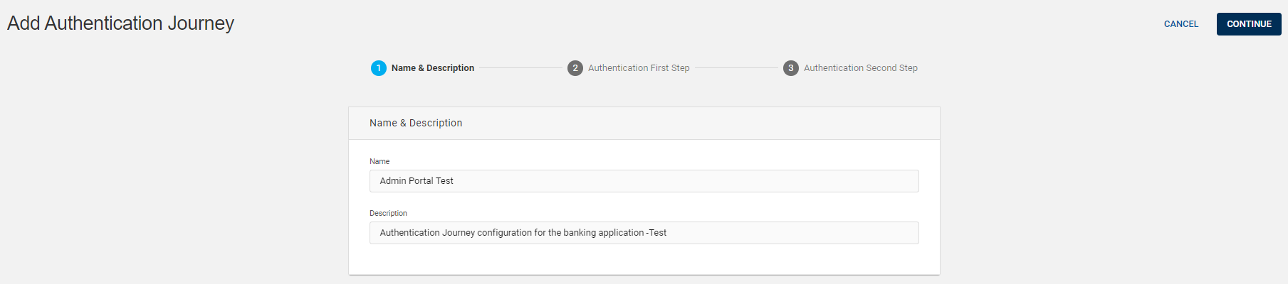 In Add Authentication Journey page, enter the name and description of authentication journey. Click CONTINUE for authentication first step and second step to complete the creation of an authentication journey.