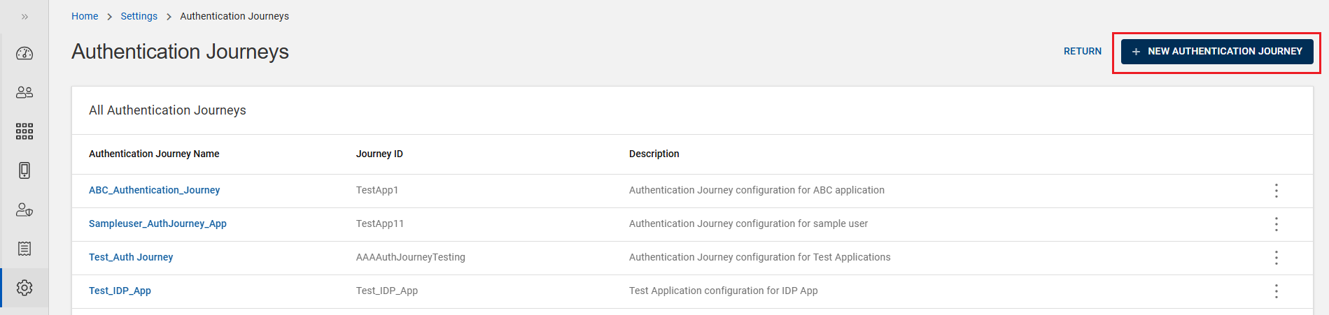 Click Authentication Journey on the Settings page to open Authentication Journeys page.