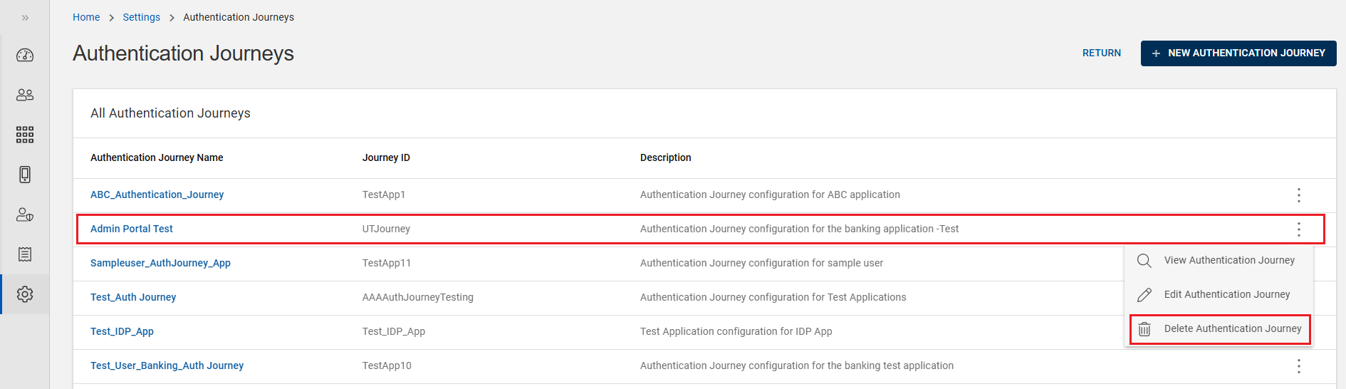 To delete an authentication journey, follow the below steps: