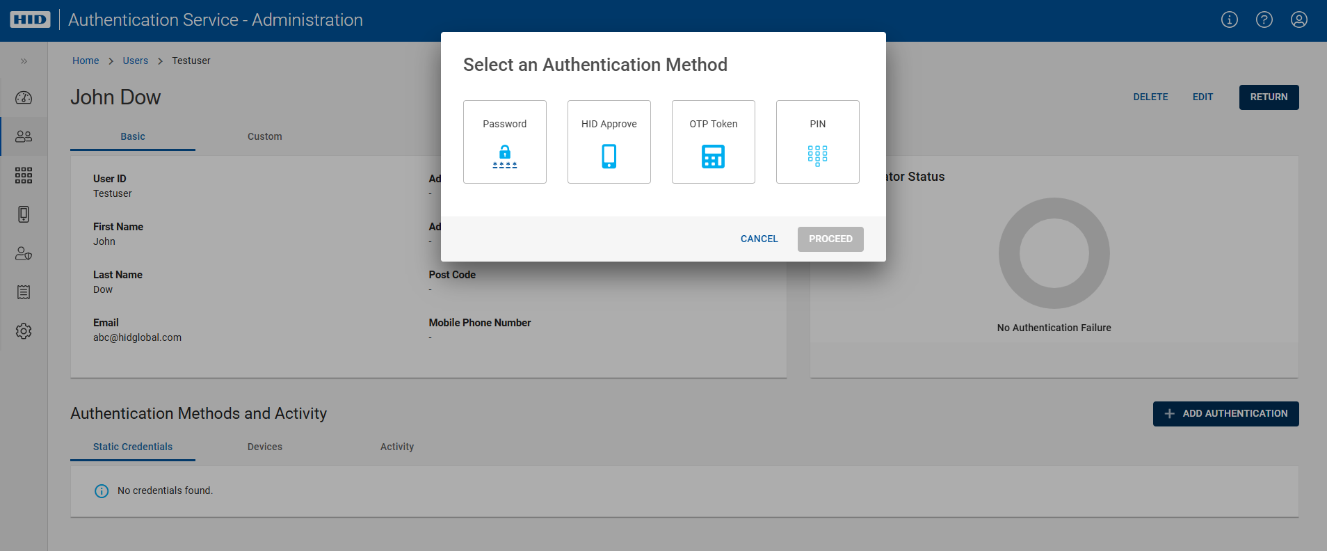 Select one or more of the authentication methods below based on your requirements, then click PROCEED to add the selected authentication method(s).